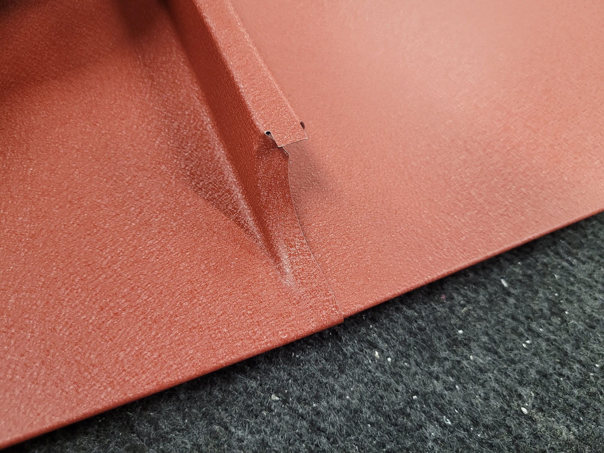 Panel prawy na rąbek do deski czołowej. Tego typu panele stosujemy do zabezpieczenia deski czołowej. Panel jest przygotowany do felcowania. Dolna część paneli jest zacięta w łezkę i przetłoczona.