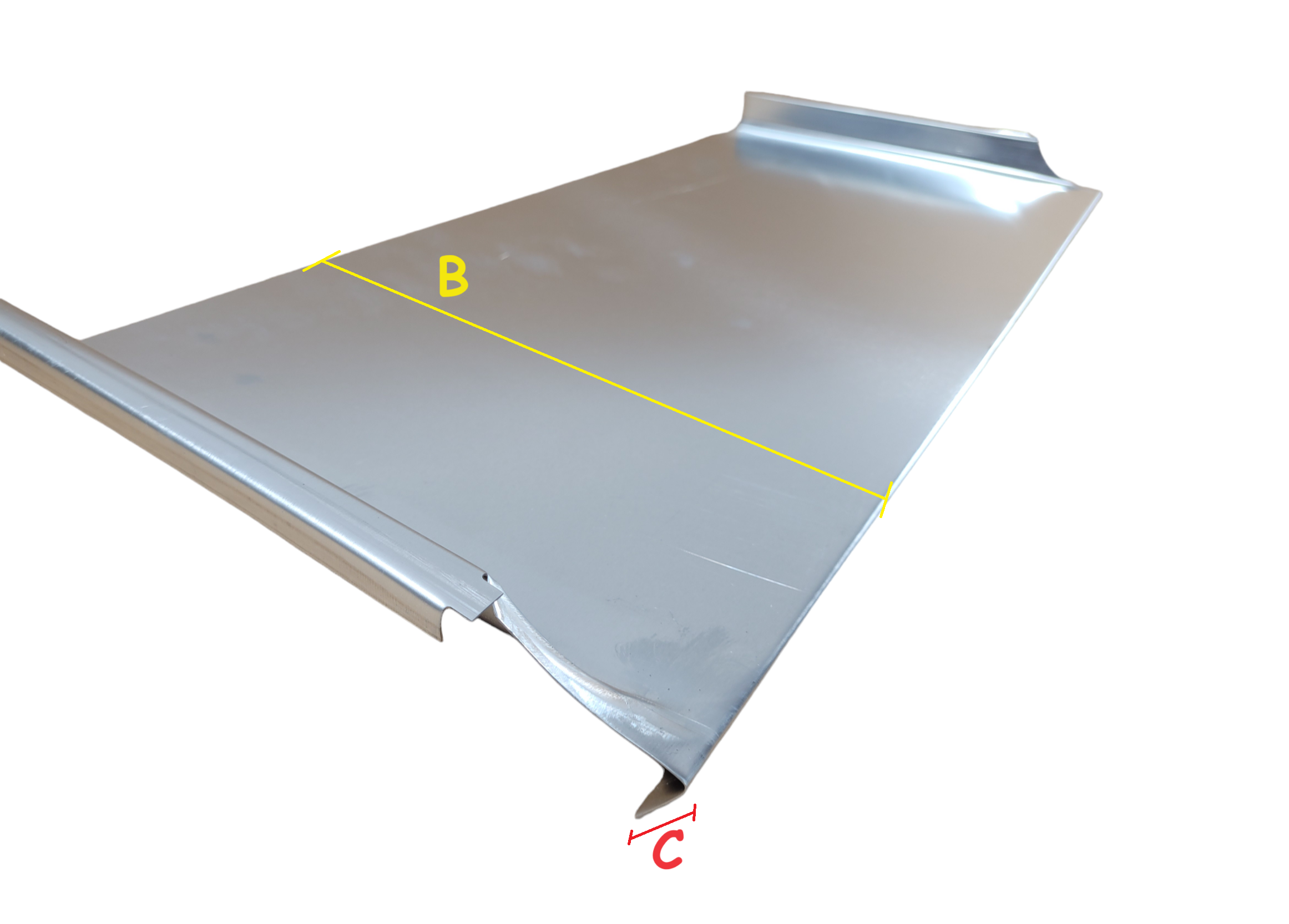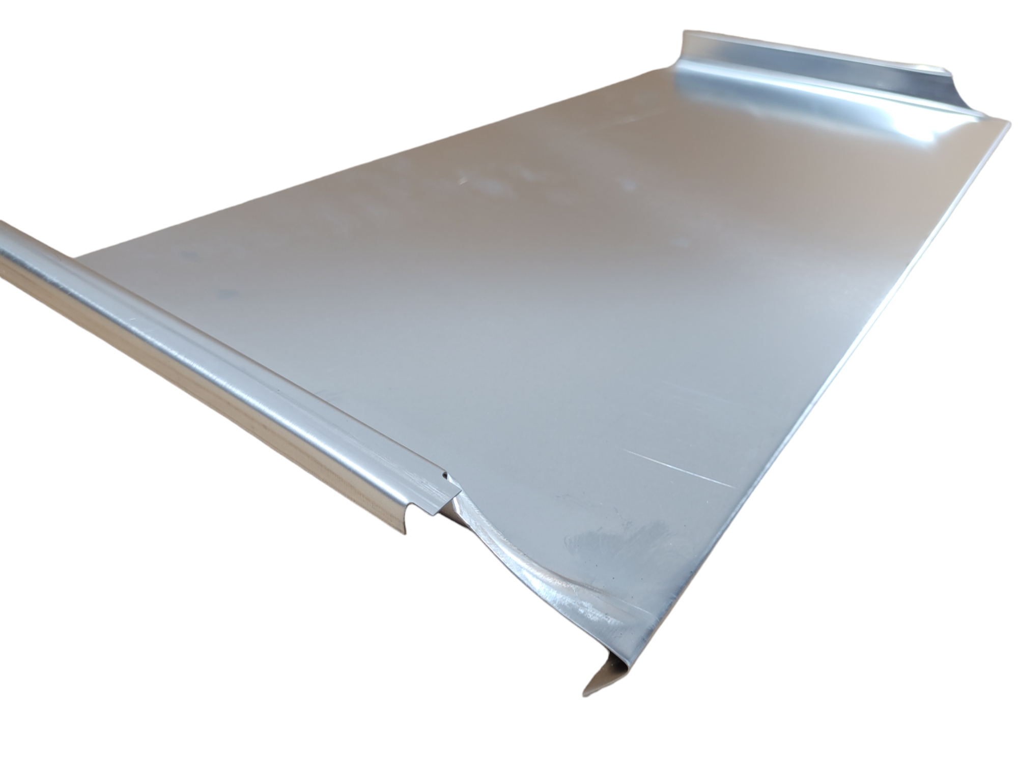 Panel prawy na rąbek do deski czołowej z blachy tytan cynk. Tego typu panele stosujemy do zabezpieczenia deski czołowej. Panel jest przygotowany do felcowania. Dolna część paneli jest zacięta w łezkę i przetłoczona.